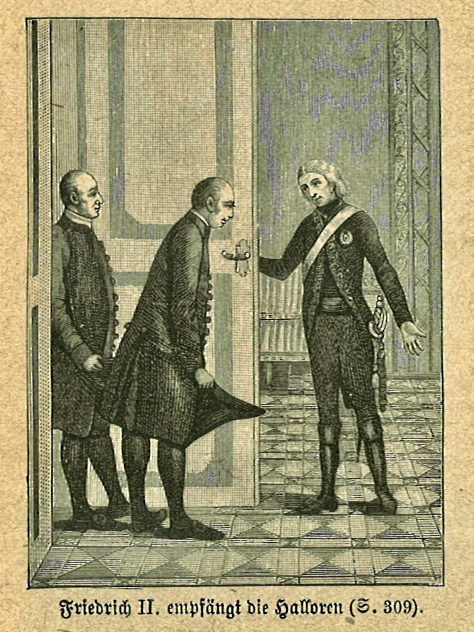 Anno 1704, zum Nei’n Jahre, kamb Keenich Friedrich der erschte jrade vun’Rechiern un wulle friehschticken. Da saate där hoche Härre ze sei’m Lakei: „Du, Aujust, hole uns emah zwee mah for fin’mzwanzch Fenniche Schlakworscht, heite jäm mersch emah nowel!“ – „Allerjnädigste Majeschtät“ saate nu där Aujust- „wollen jehorsamst jeruhen, awwer heite sin de Laden zu!“ „Ach freilich“, saate der Keenich un kratzte sich uffem Koppe, „freilich, du kinntest’che hinten rum zum Laden ‘nein, awwer for mich därfste das nich, ich bin doch der erschte Diener im Schtaate un muß „jehorsamst jeruhen“ - hast recht Aujust!“ - Nu war’n de Hallor’n jrade da zum Jratteliern, mett’r Salztorte un mett’n Sooleiern, un da saat Riemersch Andrees: „Majeschtet“, saate, „de Bärliner Schlackworscht, die toocht nich viel, mir bringen uns unse immer met, wollter-sche ‘mah kosten?“ Un da langet där aus seiner Rockficke raus e Schticke Schlackworscht un hält se in Keenich hin. Majeschtet knipp ab, kost’e un satte: “Dunnerlätschtock“, saate, „die schmeckt nach mehr!“ Da jab Moritz’ Nante, der Kranich, sei Schticke ooch noch hin. Nu war awwer däm sei Vetter, Morit’z Fritze no da. Där riehrte sich nich. Der Keenich muffelte sei’n letzen Happen ’nunter un denn guckte Fritzen ahn, als wie: „na Fritze, hast du’n keene?“ Där awwer saate: „Majeschtet“, saate, un jriff in de Ficke - „ich bin e armes Luder un esse blos Färdeworscht!“ „Nee, die mark’ch nich“, saate der Keenich un winkte ab_ „awwer weil du e armes Luder bist - dä - haste zähn Luisdor, koof der e janzes Schwein!“ Da machten awwer die andern e Jesichte. Fritze hatte nämlich enne doppelte Portion Schlackworscht in der Ficke, där aß doch keene Färdeworscht. Daß där nu die doppelte Portion noch hatte un zähn Luisdor ohmdrein, horre, das wurmete je nu die andern. Na, awwer der Keenich wulle’no wissen, wu-se de Worscht här hetten. – Da saate Fritze, der Schbrecher: „Majeschtet, die koofen mir nich, die machen de Vettern sälwer, hauschlachten!“ Ob se denn nu in Keenich nich welche da dervun verkoofen kennten, wulle där wissen. „Nee“, saaten die, se hetten kee Privilegium. „Na, wenns weiter nischt is“, saate der Keenich, „denn jäw-ich eich’s Privilegium, denn nennt-er eich >de Rochschlächter im Thale<. Da habt-er doch e kleen Nämverdienst, wenn-er emah kalt licht, mit’r Fanne, nich? Awwer das saa’ ich eich: zum Nein Jahre misst-er mer jedesmah enne Schlackworscht mitbringen, als e Kostehappen, denn janz umesunst is der Tod - ooch for mich - verschehter?“ „Jawohl, Majeschtet“, saaten die un jingen heeme.