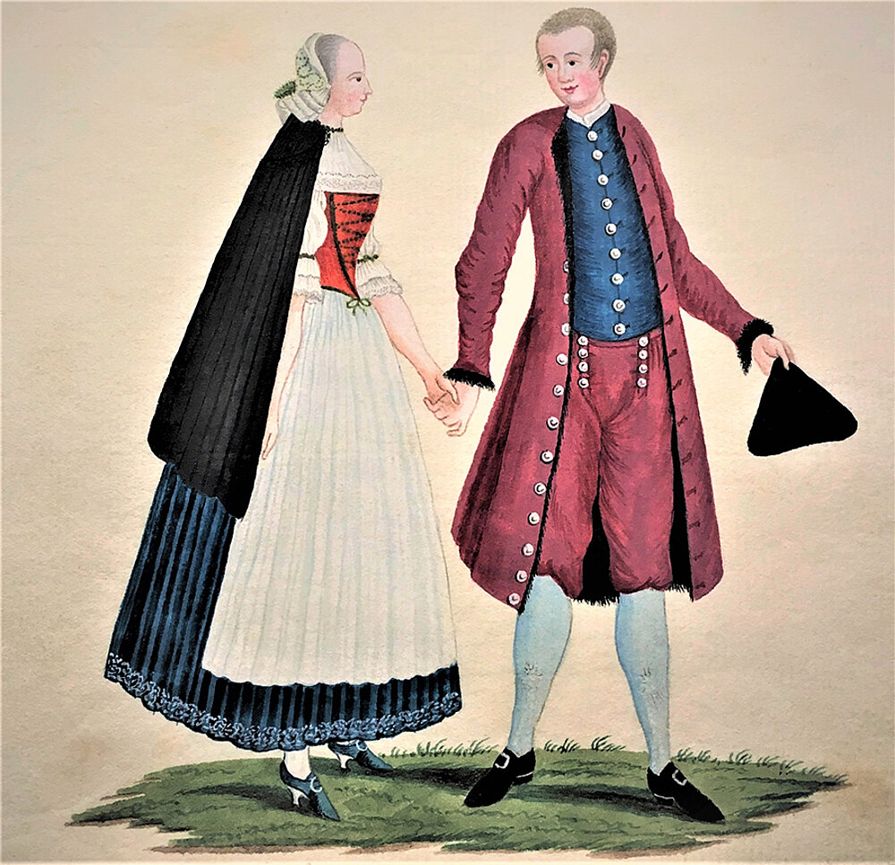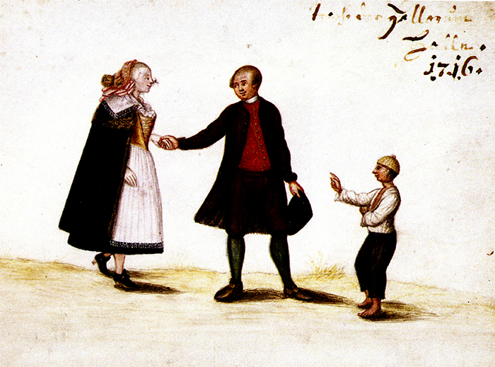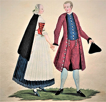 Anfang des 18. Jahrhunderts hob sich besonders die Kleidung der Hallorenfrau deutlich hervor. Zu reich verzierten Umhängen, Blusen und Hauben sah man sie in steifen, wattierten Röcken, wie das „Nutzbare, galante und curioese Frauenzimmer-Lexicon" von 1715 ausführlich beschreibt. Aus dem Jahr 1716 stammt eine frühe Zeichnung eines Halloren mit seiner Frau. Neben ihr trägt er ein einfaches dunkles Oberkleid mit Knopfreihe, dazu einen knielangen Mantel, Kniebundhose und einfache Schnallenschuhe.