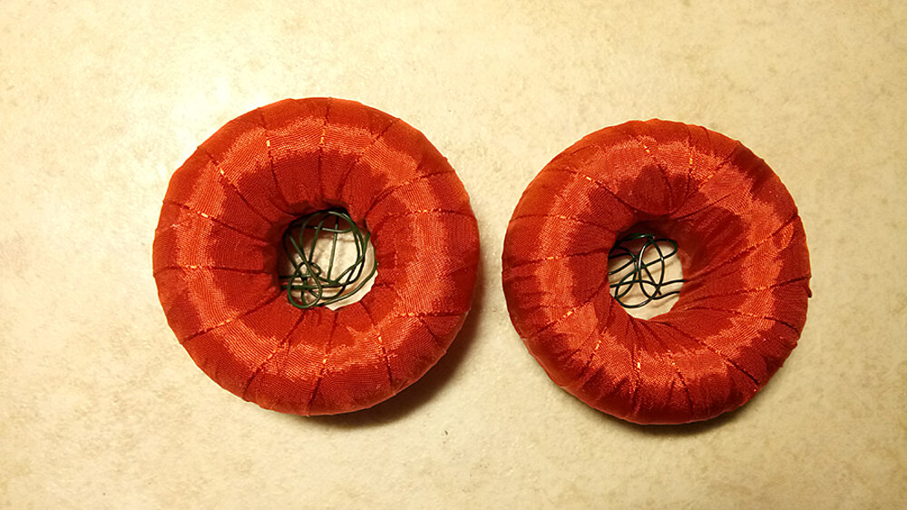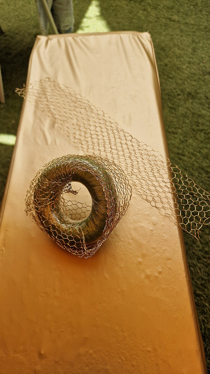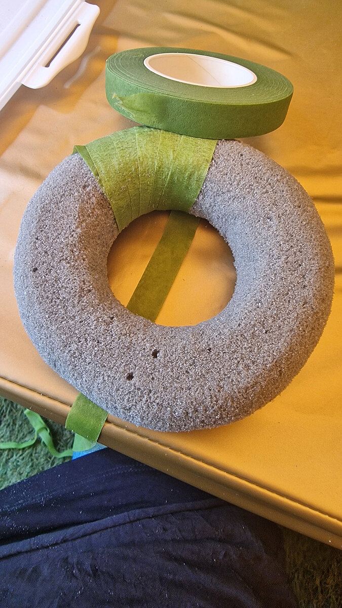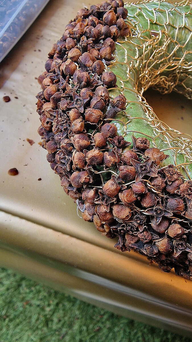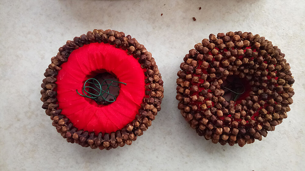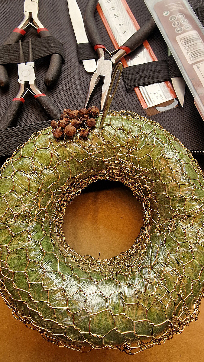 Die Gestalterin verwendete Steckmasse aus dem Garten- und Freizeitbedarf und schnitt daraus einen kranzförmigen Rohling (Römer) zu. Für zusätzliche Stabilität umwickelte sie ihn mit grünem Floristenband. Anschließend flocht sie ein dünnes Drahtnetz in Rautentechnik und wickelte es um den Grundkörper. Auf das mühsame Aussortieren der Gewürznelken folgte ein Einweichen in Wasser für mehr Haltbarkeit und Stabilität.