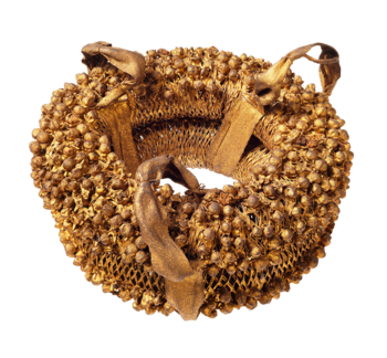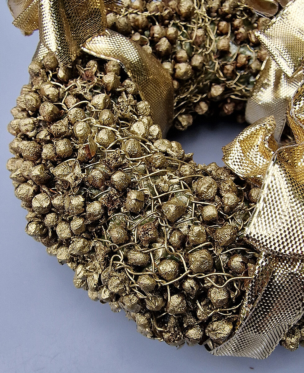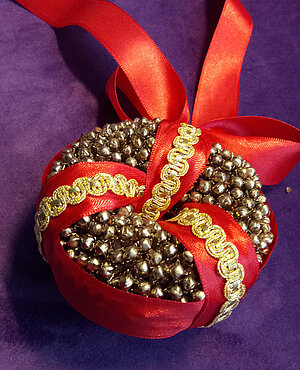 Anschließend stach sie mit dem Vorstecher kleine Löcher in den umwundenen Rohling und steckte die getrockneten Nelkenspitzen hinein. Durch das Rautennetz konnten sie nicht, wie bei Hallore Volker, in Reih und Glied angeordnet werden, sondern stehen auch mal schräg hervor. Dies schadet dem kunstvollen Ergebnis aber nicht. Mit goldenem Acrylfarbspray, das wasserfesten Lack zur Versiegelung enthält, wurde die Krone rundum eingefärbt. Zum Abschluss erhielt sie dann noch drei goldene Schleifen.