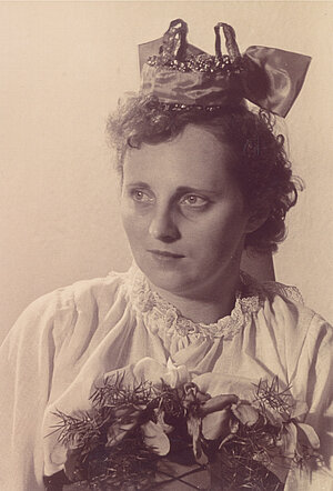 Die zwei fotografierten Hallorenbräute Emmi und Karla tragen Nelkenkronen, die Hallore Volker originalgetreu für sie angefertigt hat.
