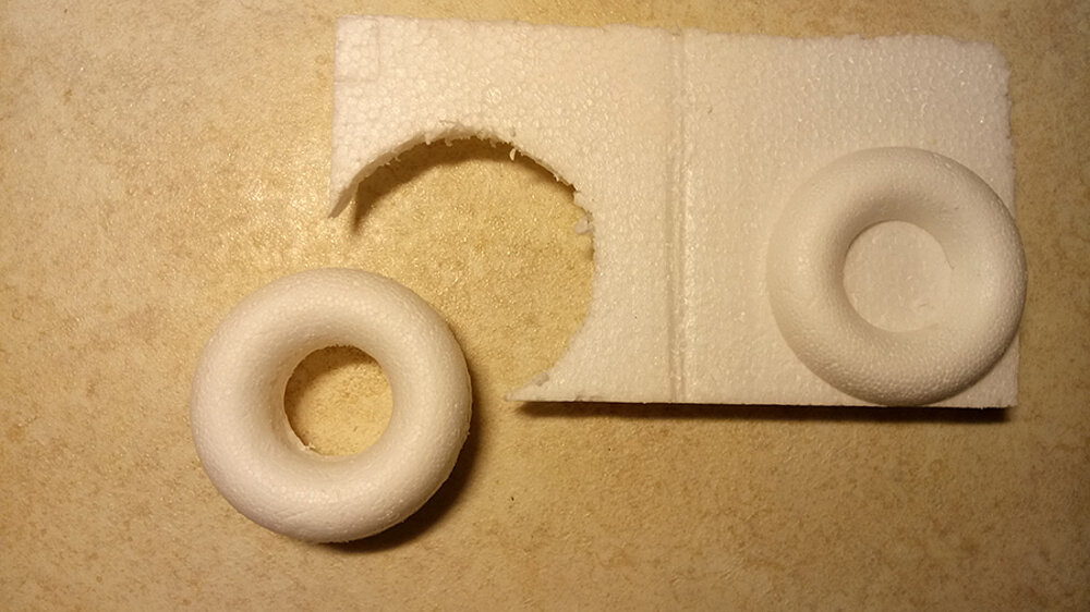 Er beginnt den Bau einer Nelkenkrone mit zwei halben Styroporringen aus dem Bastelbedarf. Die Ringe haben zusammen aber noch nicht die richtige Höhe. Deshalb klebt Volker eine weitere Styroporplatte dazwischen und fertigt daraus seinen Grundkörper.