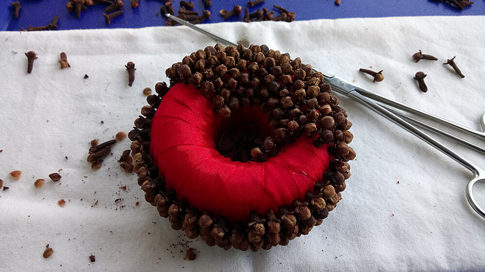Volker sticht mit einer spitzen Schere kleine Löcher vor, bevor er mit einer Mischung aus Fingerspitzengefühl und Kraft die Gewürznelken in den Rohling steckt. Dabei bleibt die Unterseite des Grundkörpers, an der sich die Befestigungslöcher für die Kinnbänder befinden, frei. Die zackigen Knospen sollen beim Tragen nicht auf dem Kopf kratzen.